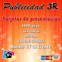 Millar de tarjetas de presentación impresas en offset a 4×1 tintas (totalmente a color por el frente y en b/n en el reverso), sobre papel couché de 300grs. y con una cobertura de Barniz U/V por el frente; con el diseño que necesites para tu empresa o negocio.