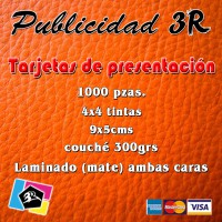 Millar de tarjetas de presentación impresas en offset a 4×4 tintas (totalmente a color por ambas caras), sobre papel couché de 300grs. y con una cobertura plástica (laminado mate) por los dos lados; con el diseño que necesites para tu empresa o negocio.