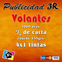 Millar de volantes ¼ de carta impresos en offset a 4×1 tintas (totalmente a color por el frente y en b/n en el reverso), sobre papel couché de 135grs.